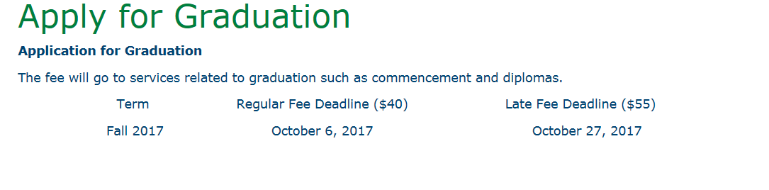 Seniors and Graduate students: If you planning to graduate this fall, please be sure to login to your SAIL account to apply by deadline. See dates below: