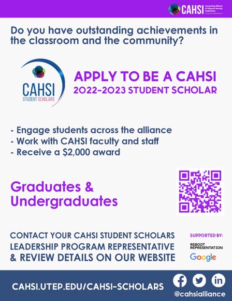 CAHSI students (undergraduate & graduate) who are pursuing a degree in a computing field and who have demonstrated exceptional achievement in technical knowledge and service to the community are eligible for this program. Individuals who are selected as a CAHSI Student Scholar will receive a $2,000 monetary award. CAHSI staff and faculty will work with each named CAHSI Scholar during the 2022-23 academic year to develop a work plan that engages their peers across the alliance.